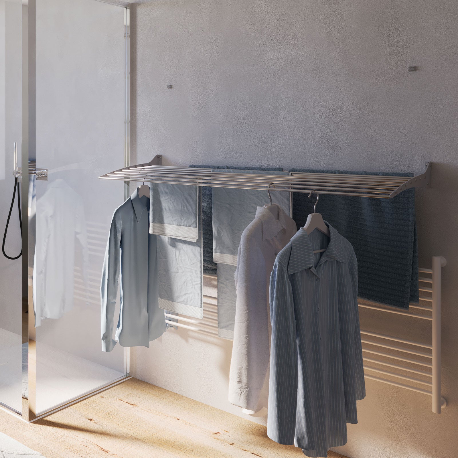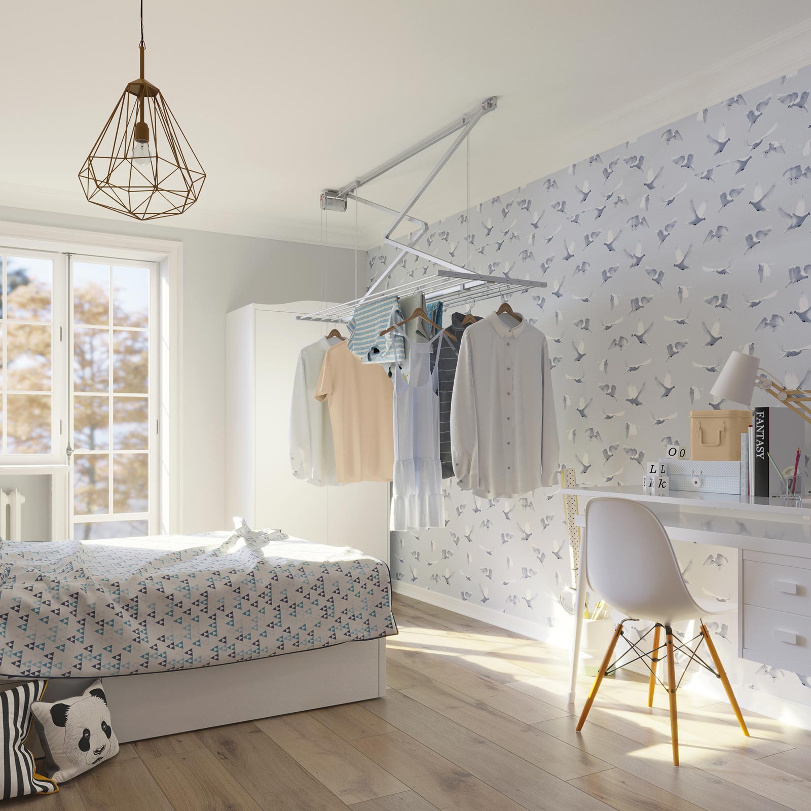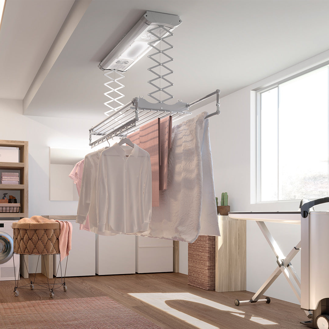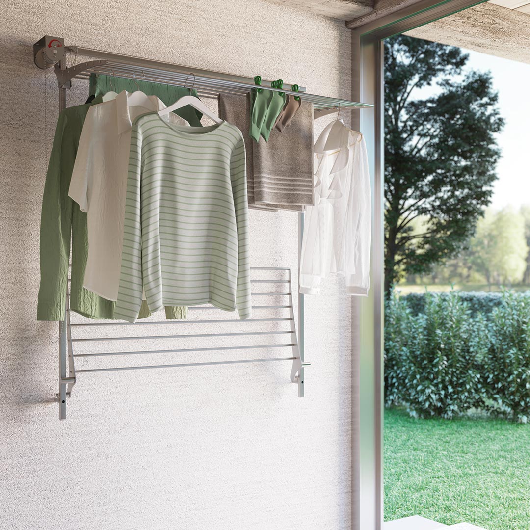 Alle unsere Modelle sind Wäscheständer für die Decke und die Wand. So besteht keine Gefahr, dass die Wäsche im Haus herumwandert.