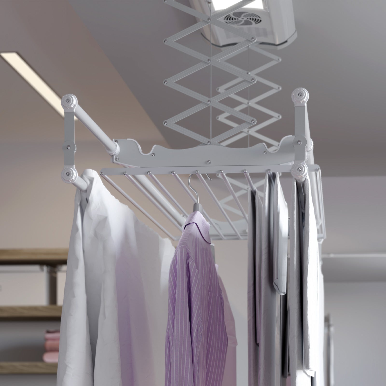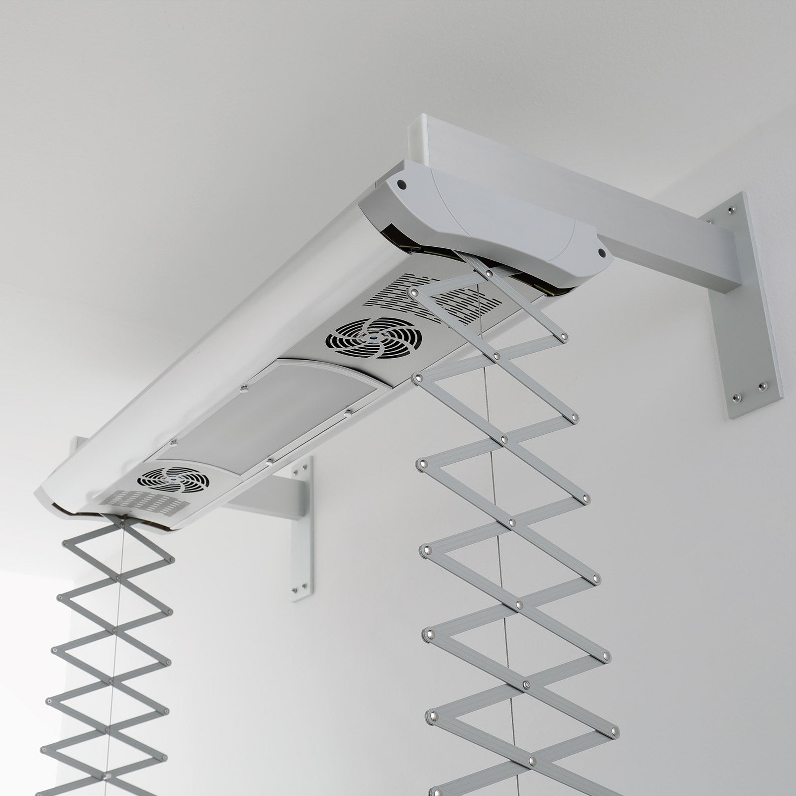 Peut être abaissé jusqu'à 1,80 mètre du mur et arrêté à n'importe quelle hauteur grâce à une télécommande, facilitant la gestion du linge.